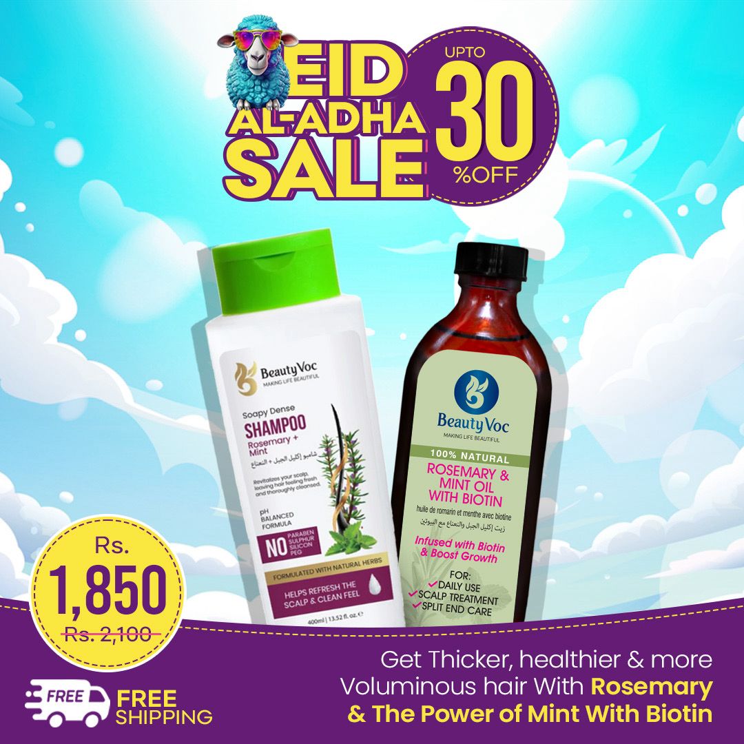Pure Rosemary Mint Biotin Oil & Rosemary Mint Shampoo (Sulphur Free) infused with biotin, rosemary, and mint, this powerful duo helps reduce hair fall, promote thicker growth, and improve scalp health.